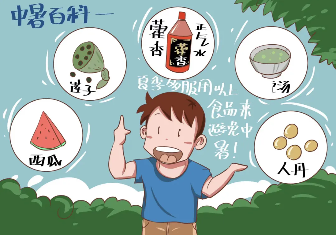 在酷暑,注意饮食清淡,爱吃辛辣食物的同学不宜吃太多。推荐西红柿,生菜,黄瓜、苦瓜、冬瓜、丝瓜、莲子、薏仁、红豆、绿豆等食物,水果推荐西瓜、柠檬、杨梅、香瓜、梨、山竹等,既能解渴也能补充水分。